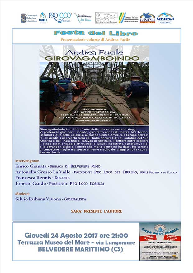 Giovedì 24 agosto 2017, alle ore 21.00, a Belvedere Marittimo, cittadina del Tirreno cosentino, sarà celebrata, nel suggestivo e incantevole scenario naturale del Museo del Mare, la Festa del libro con la presentazione del volume Girovaga(bo)ndo di Andrea Fucile.