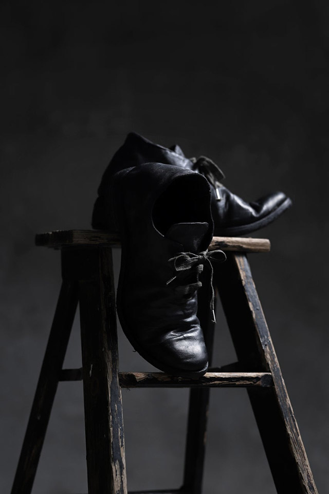 Ogni strato, ogni cucitura, ogni imperfezione è parte del racconto. Le sue scarpe sembrano uscite da un passato dimenticato o da un futuro che rifiuta la plastica. Non seguono le stagioni, non conoscono marketing, non si piegano alla serialità.
