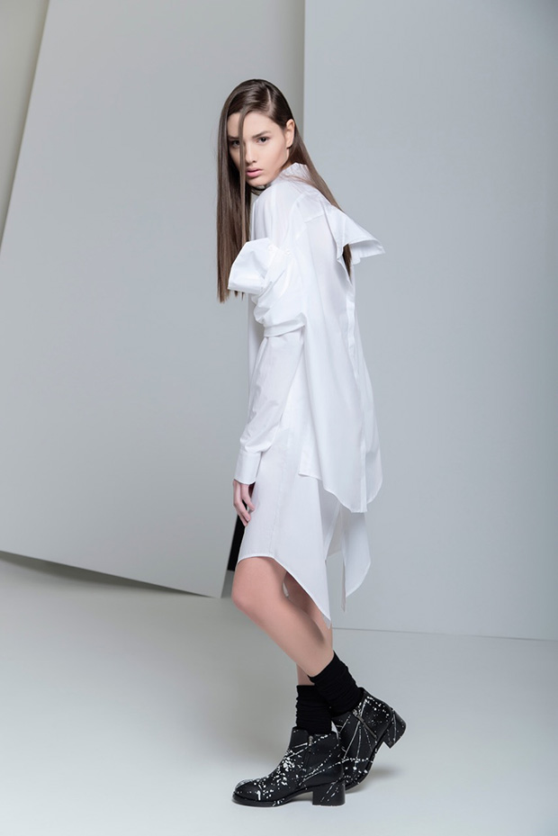 Sorprende una camicia ornata da un pannello che diventa quasi un grembiule, affermando il concetto che la camicia bianca diventa paradigma del minimalismo, presentandola morbida, lunga e svasata con collo a solino, maniche ampie e arricciature, gli scolli coreani minimali, ed infine camicie che diventano quasi mini abiti dall’ eleganza fragile, il popeline di cotone si fa pesante per il cotè androgino che si affianca alla seta strech femminilissima.