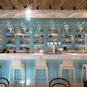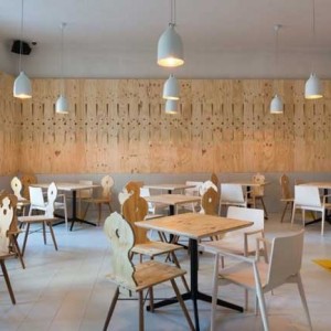 La mobilia scandinava anni 60 si ibrida con l’eleganza del gotico nella morbidezza delle pareti celesti. I vecchi assi in legno del soffitto contrastano con il marmo dei banconi, mentre il tocco informale del legno stride piacevolmente con la stube austriaca. Rustico e delicato insieme, fra ironia e bon ton.
