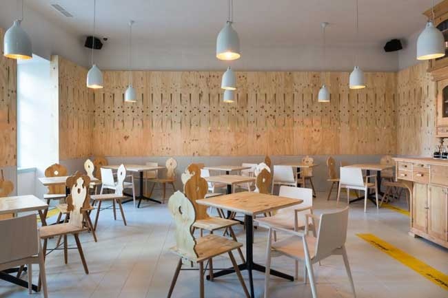 La mobilia scandinava anni 60 si ibrida con l’eleganza del gotico nella morbidezza delle pareti celesti. I vecchi assi in legno del soffitto contrastano con il marmo dei banconi, mentre il tocco informale del legno stride piacevolmente con la stube austriaca. Rustico e delicato insieme, fra ironia e bon ton.