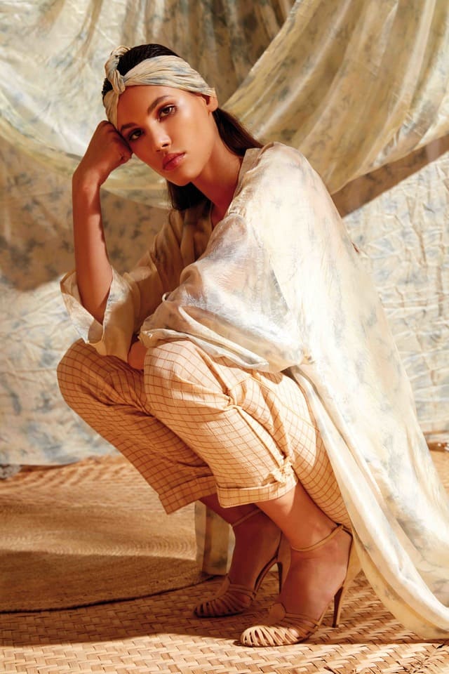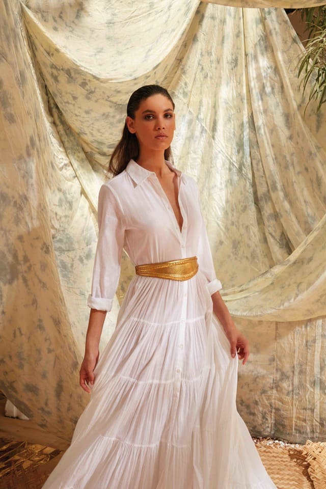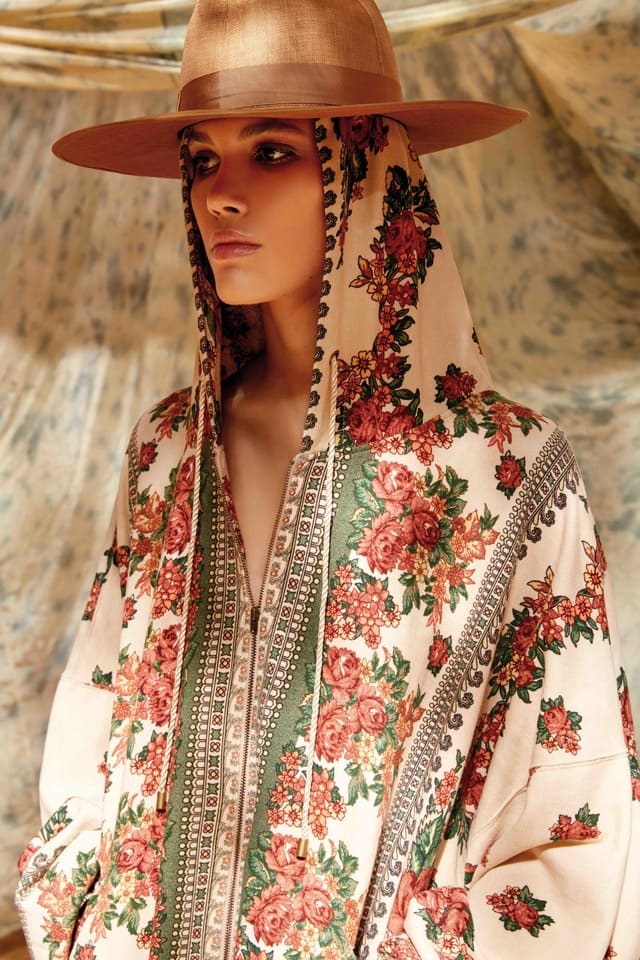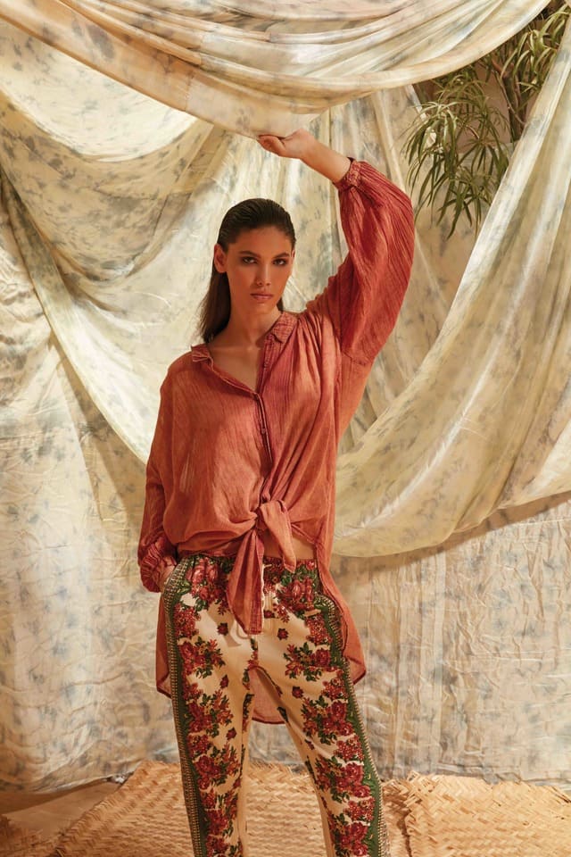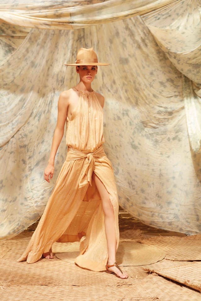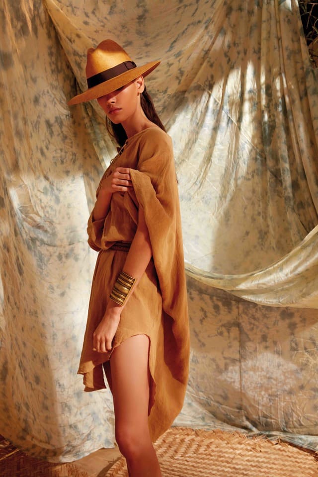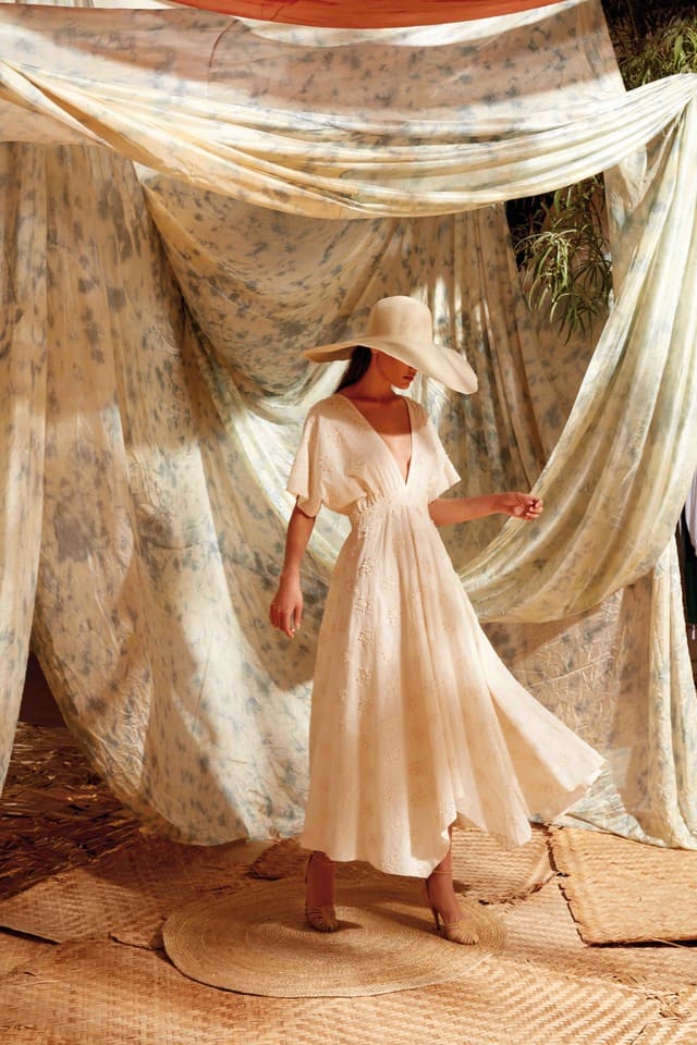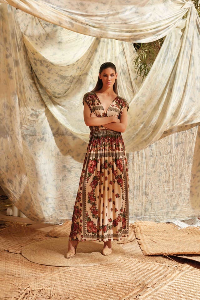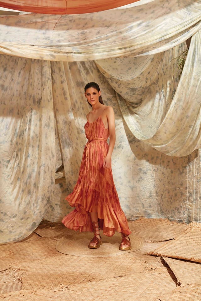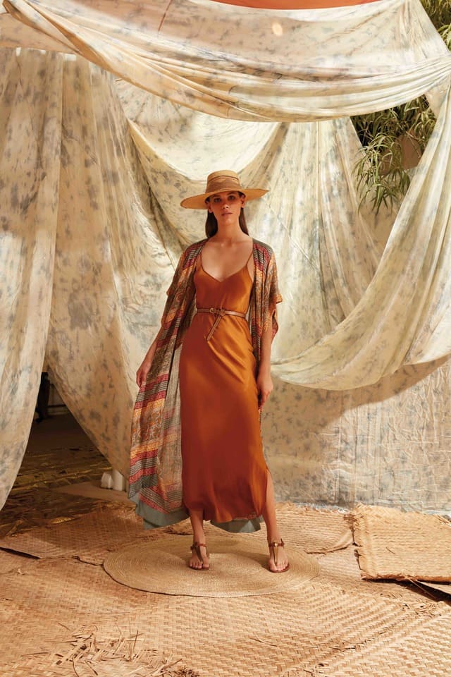Da questo respiro tellurico nascono abiti che ricordano gli ombrelli ricamati di seta e cotone. Dalla visione di grandi tendaggi prende vita la parte della collezione in tie dye con le sfumature di incantevoli cieli nembosi. Dai materiali nobili i pigmenti orchestrano le sfumature dei beige. Un omaggio alla natura, con le stampe floreali, alla terra e alle spezie, per i colori presi in prestito. All’essenziale, per il suo stile inconfondibile e unico. Passione per la qualità ricercata. Sete stampate e non, cotoni ricamati, garze lurexate, lini accesi da micro paillettes, organze leggere e sinuose sono i protagonista della collezione che danno forma alle inconfondibile silhouette dallo stile etnico-chic.