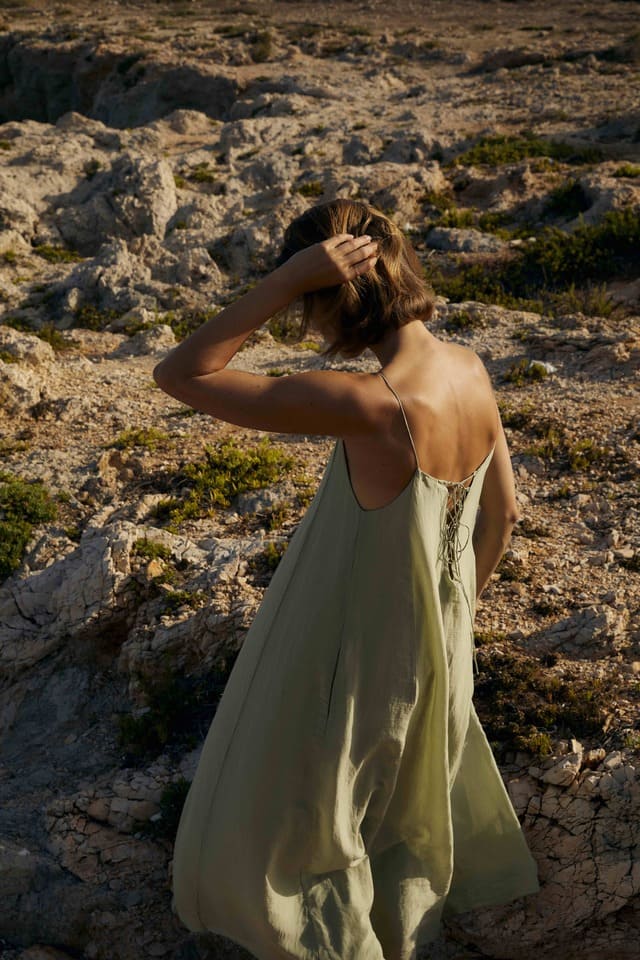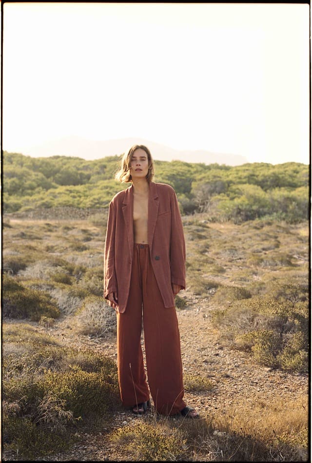 I tessuti scelti sono il tencel fluido e opaco per il trench strutturato color kaki, nella texture a resca con effetto stropicciato ed irregolare. In questi toni troviamo anche la rinnovata proposta del denim, rivisitato nel colore grigio con lavaggio ”stone” a freddo che crea una tela sbiadita e tridimensionale. L’aspetto più polveroso ed etereo dei capi tinti naturalmente, cede il passo alla luminosità dei toni freschi dei rasi di seta e al beachwear da indossare anche per dei look sofisticati e ricercati.