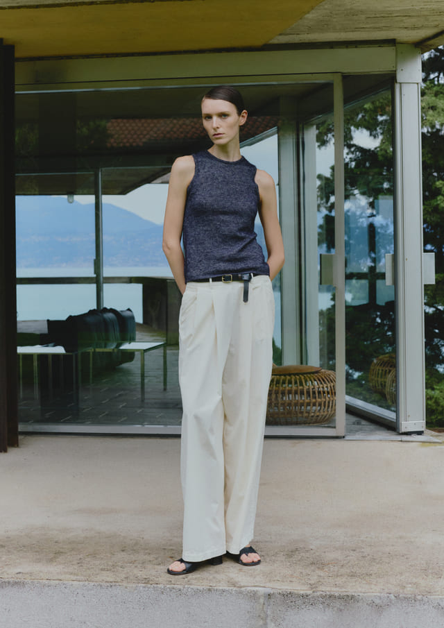 La ricerca e la selezione dei tessuti rappresentano da sempre una parte caratterizzante delle collezioni di Pomandère e per la prossima stagione estiva, il protagonista è il popeline, presentato tinto capo in una cartella colore dai toni pastello, rigato in azzurro e ricamato sangallo per una parte più femminile. Nuovo è il suo utilizzo come base pantalone, in una qualità fresca e croccante dall’aspetto tecnico. La camiceria è ampia e differenziata, proponendo una mussola di cotone rigata tono su tono, un voile a macro-riga e una garza mossa effetto maglia.