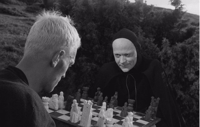 Un frame della partita a scacchi con la morte tratto da “Il settimo sigillo”
